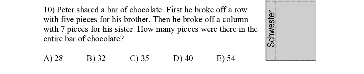 Q10. Peter shared a bar of chocolate. First he broke off a row with five pieces for hi s brother. Then he broke off a column with 7 pieces for his sister. How many pieces were there in the entire bar of chocolate?