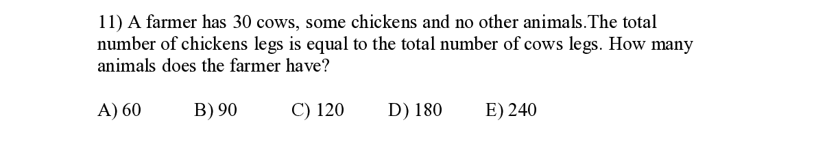 Q11. A farmer has 30 cows, some chickens and no other animals.The total number of chickens leg s is equal to the total number of cows legs. How many animals does the farmer have?