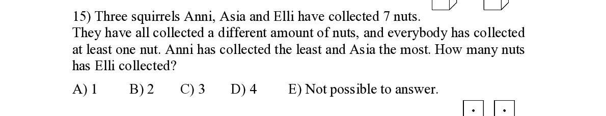 Q15. Three squirrels Anni, Asia and Elli have collected 7 nuts. They have all collected a different amount of nuts, and everybody has collected at least one nut. Anni has collected the least and Asia the most. How many nuts has Elli col lected?