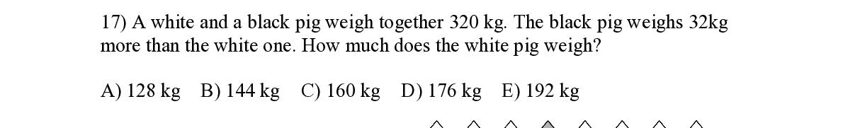 Q17. A white and a black pig weigh together 320 kg. The black pig weighs 32kg mo re than the white one. How much does the white pig weigh?