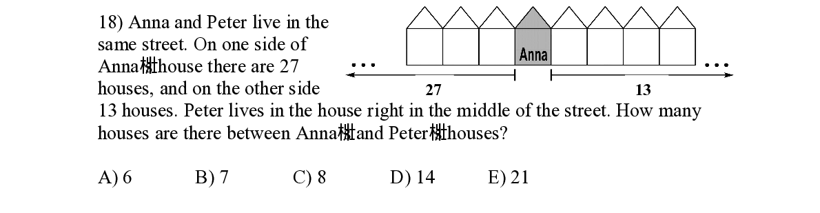 Q18. Anna and Peter live in the same street. On one side of Anna ’ s house there are 27 houses, and on the other side 27 13