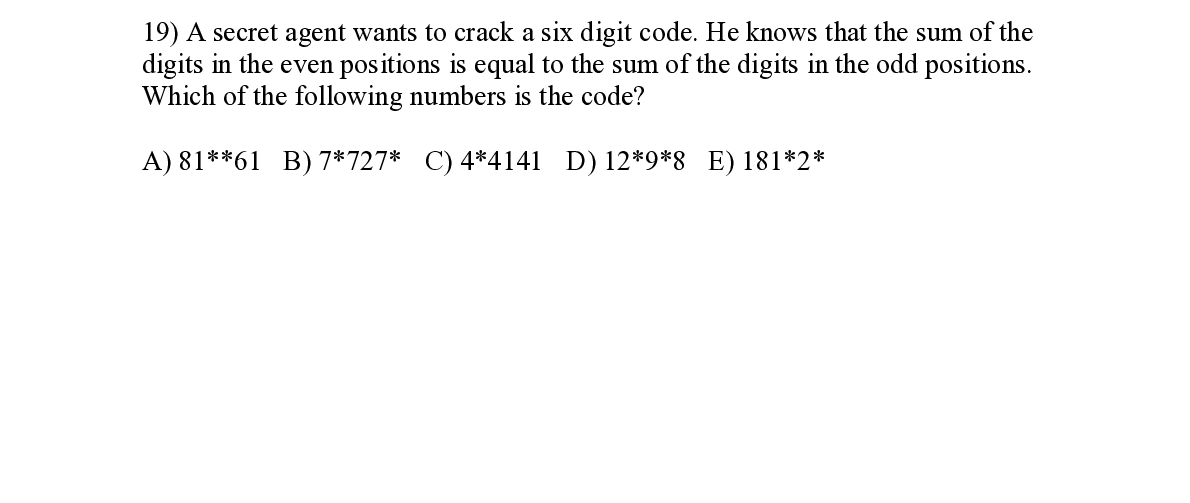 Q19. A secret agent wants to crack a six digit code. He knows that the sum of the digits in the even positions is equal to the sum of the digits in the odd positions. Which of the following numbers is the code?