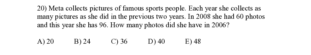 Q20. Meta collects pictures of famous sports people. Each year she collects as many pictures as she did in the pr evious two years. In 2008 she had 60 photos and this year she has 96. How many photos did she have in 2006?