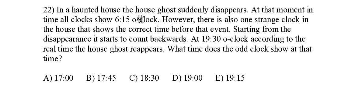 Q22. In a haunted house the house ghost suddenly disappears. At that moment in time all clocks show 6:15 o ’ clock. However, there is also one strange clock in the house that shows the correct time before that event. Starting from the disappearance it starts to count backwards. At 19:30 o - clock according to the real time the house ghost reappears. What time does the odd clock show at that time?