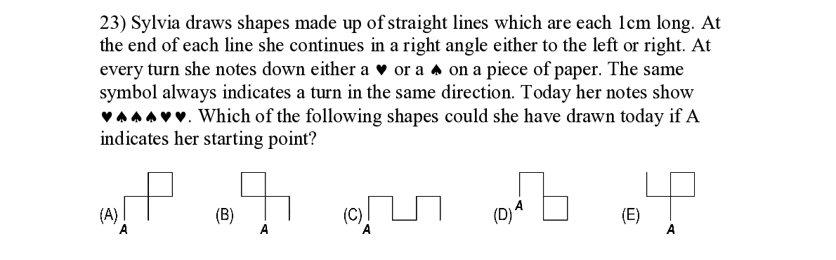 Q23. Sylvia draws shapes made up of straight lines which are each 1cm long. At the end of each line she continues in a right angle eit her to the left or right. At every turn she notes down either a © or a ™ on a piece of paper. The same symbol always indicates a turn in the same direction. Today her notes show © ™ ™ ™ © © . Which of the following shapes could she have drawn today if A indicat es her starting point?