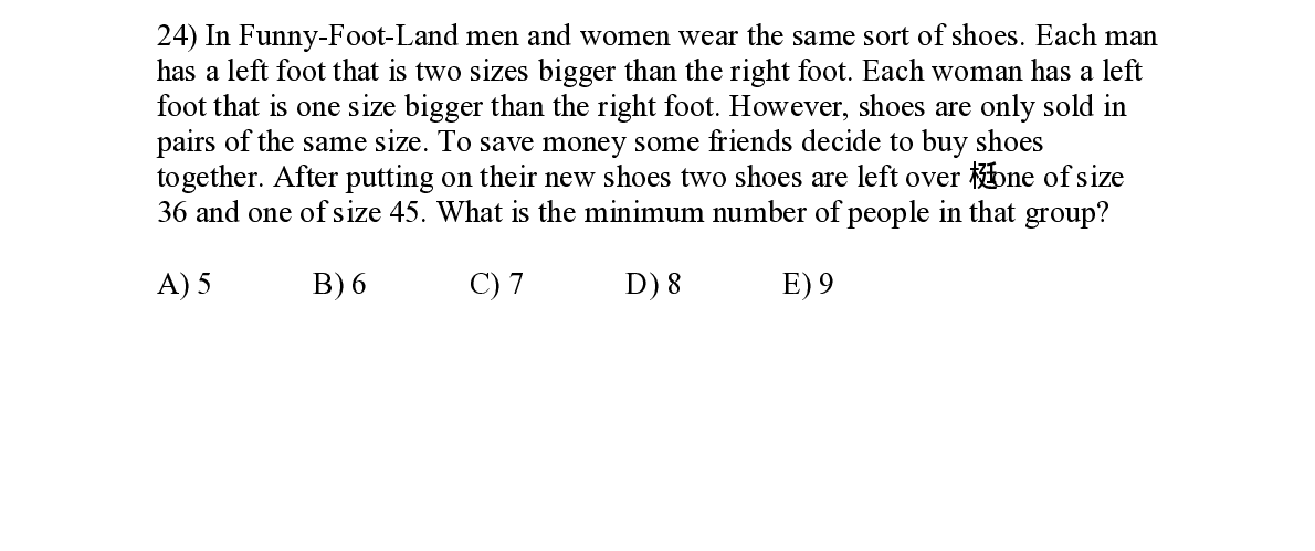 Q24. In Funny - Foot - Land men and women wear the same sort of shoes. Each man has a left foot that is two sizes bigger than the right foot. Each woman has a left foot that is one size bigger than the right foot. However, shoes are o nly sold in pairs of the same size. To save money some friends decide to buy shoes together. After putting on their new shoes two shoes are left over – one of size