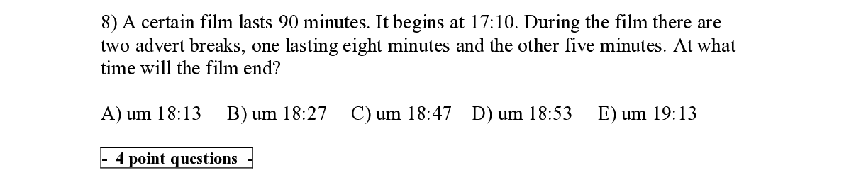 Q8. A certain film lasts 90 minutes. It begins at 17:10. During the film there are two a dvert breaks, one lasting eight minutes and the other five minutes. At what time will the film end?