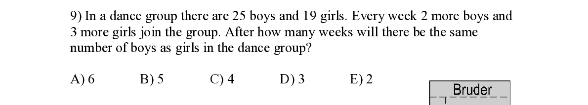 Q9. In a dance group there are 25 boys and 19 girls. Every week 2 more boys and