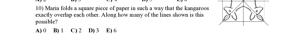 Q10. Maria folds a square piece of pape r in such a way that the kangaroos exactly overlap each other. Along how many of the lines shown is this possible?