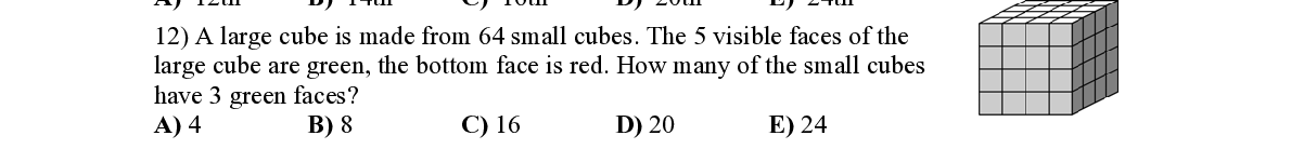 Q12. A large cube is made from 64 small cubes. The 5 visible faces of the large cube are green, the bottom face is red. How many of the small cubes have 3 green faces?