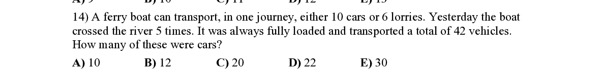 Q14. A ferry boat can transport, in one journey, ei ther 10 cars or 6 lorr ies. Yesterday the boat crossed the river 5 times. It was always fully loaded and transported a total of 42 vehicles. How many of these were cars?