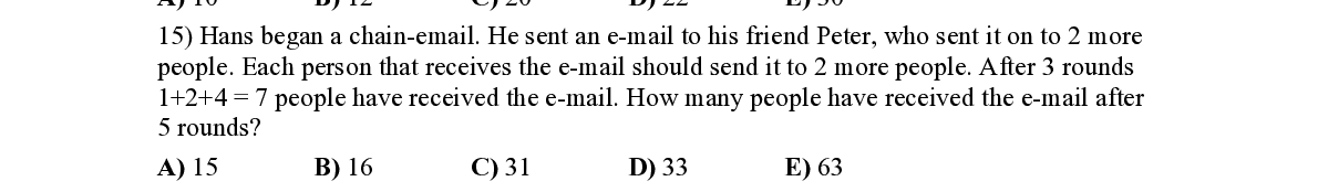 Q15. Hans began a chain-email. He sent an e-mail to his friend Peter, who sent it on to 2 more people. Each person that receives the e-mail sh ould send it to 2 more people. After 3 rounds