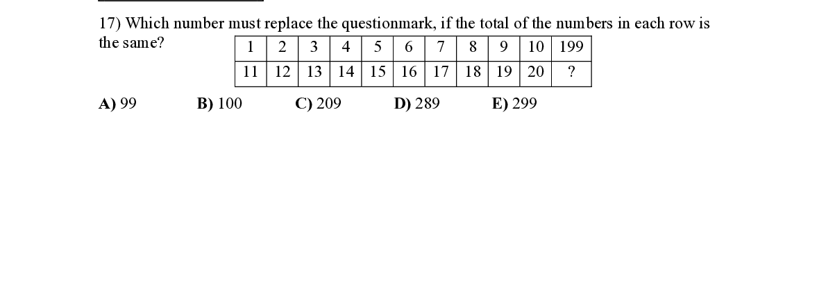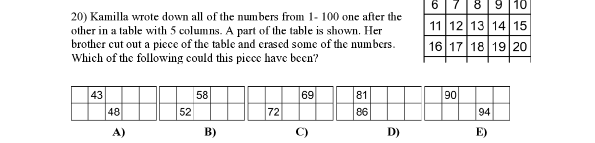 Q20. Kamilla wrote down all of the numbers from 1- 100 one after the other in a table with 5 columns. A part of the table is shown. Her brother cut out a piece of the tabl e and erased some of the numbers. Which of the following could this piece have been?