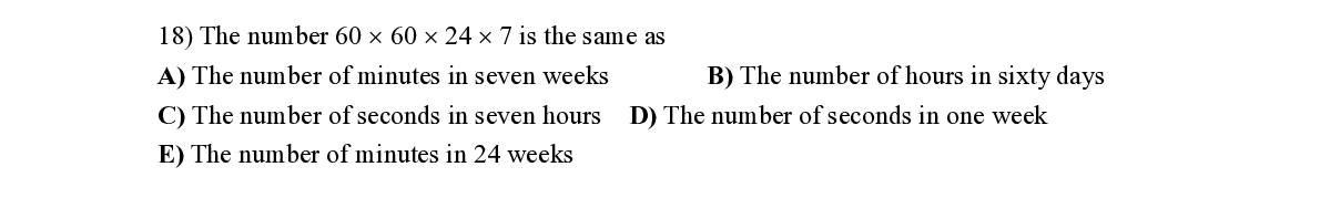 Q18. The number 60 × 60 × 24 × 7 is the same as