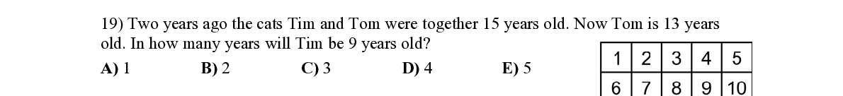 Q19. Two years ago the cats Tim and Tom were together 15 years old. Now Tom is 13 years old. In how many years will Tim be 9 years old?