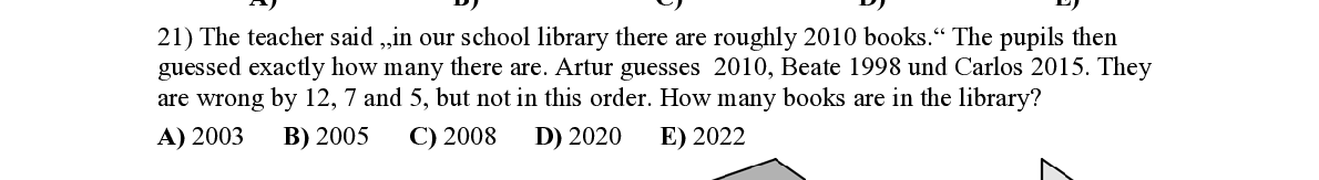 Q21. The teacher said „in our school library there are roughl y 2010 books.“ The pupils then guessed exactly how many there are. Artur gue sses 2010, Beate 1998 und Carlos 2015. They are wrong by 12, 7 and 5, but not in this or der. How many books are in the library?