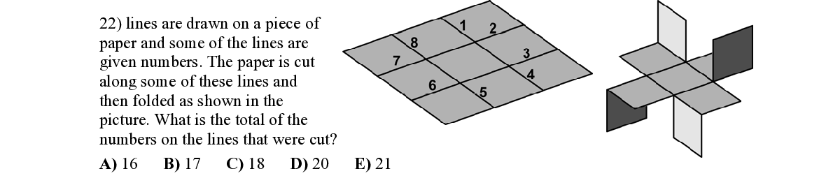 Q22. lines are drawn on a piece of paper and some of the lines are given numbers. The paper is cut along some of these lines and then folded as shown in the picture. What is the total of the numbers on the lines that were cut?