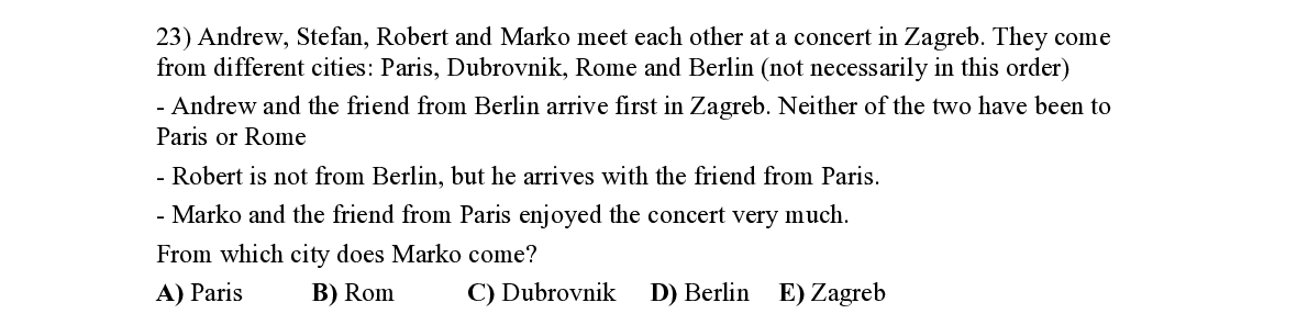 Q23. Andrew, Stefan, Robert and Marko meet eac h other at a concert in Zagreb. They come from different cities: Paris, Dubrovnik, Rome a nd Berlin (not necessarily in this order) - Andrew and the friend from Berlin arrive firs t in Zagreb. Neither of the two have been to Paris or Rome - Robert is not from Berlin, but he arrives with the friend from Paris. - Marko and the friend from Paris enjoyed the concert very much. From which city does Marko come?