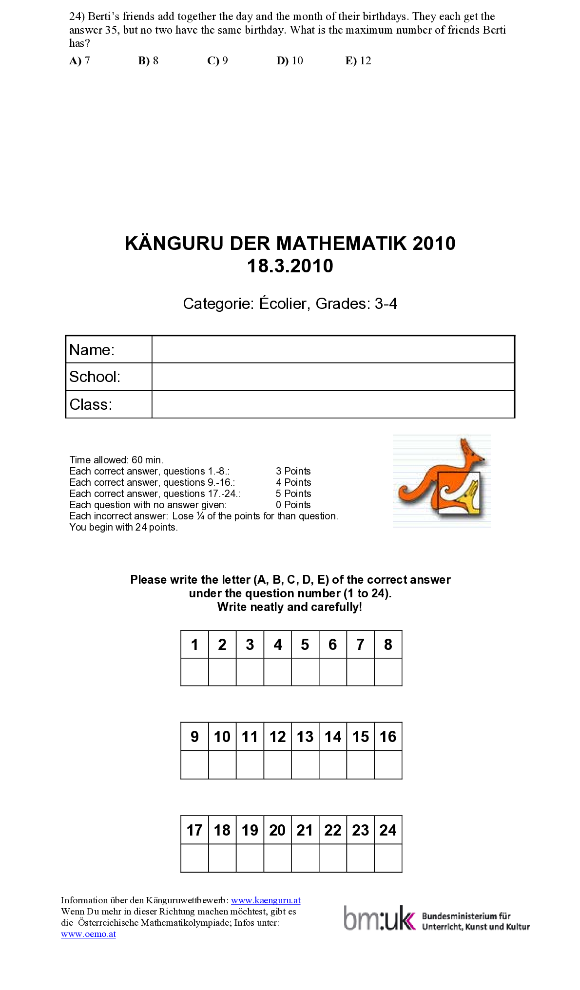 Q17. 19 20 21 22 23 24 Information über den Känguruwettbewerb: www.kaenguru.at Wenn Du mehr in dieser Richtu ng machen möchtest, gibt es die Österreichische Mathema tikolympiade; Infos unter: www.oemo.at