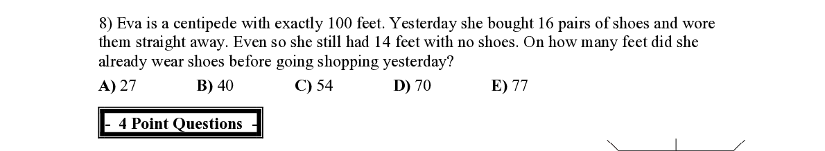 Q8. Eva is a centipede with exactly 100 feet. Yesterday she bought 16 pairs of shoes and wore them straight away. Even so she still had 14 feet with no shoes. On how many feet did she already wear shoes before going shopping yesterday?