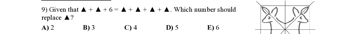 Q9. Given that ▲ + ▲ + 6 = ▲ + ▲ + ▲ + ▲ . Which number should replace ▲ ?