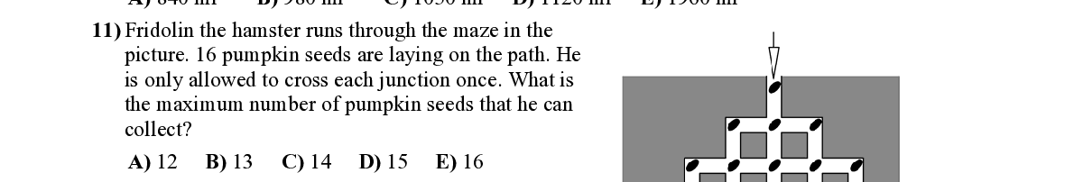 Q11. Fridolin the hamster runs through the maze in the picture. 16 pumpkin seeds are laying on the path. He is only allowed to cross each junction once. What is the maximum number of pumpkin seeds that he can collect?