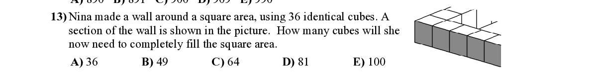 Q13. Nina made a wall around a square area, using 36 identical cubes. A section of the wall is shown in the picture. How many cubes will she now need to completely fill the square area.