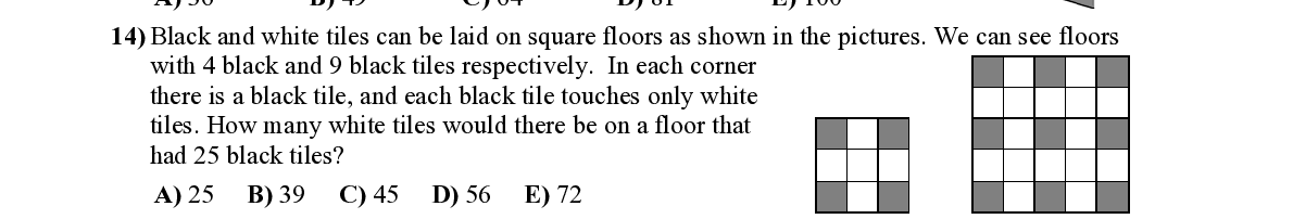 Q14. Black and white tiles can be laid on square floors as shown in the pictures. We can see floors with 4 black and 9 black tiles respectively. In each corner there is a black tile, and each black tile touches only white tiles. How many white tiles would there be on a floor that had 25 black tiles?
