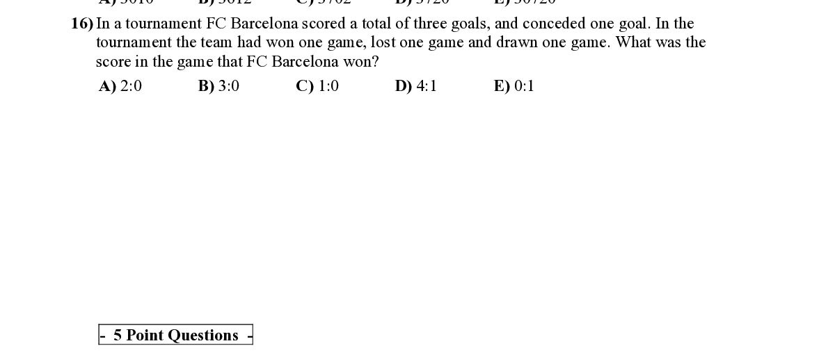 Q16. In a tournament FC Barcelona scored a total of three goals, and conc eded one goal. In the tournament the team had won one game, lost one game and drawn one game. What was the score in the game that FC Barcelona won?