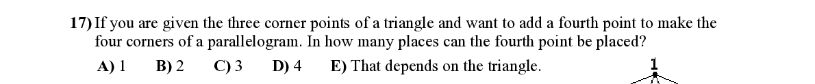 Q17. If you are given the three corner poi nts of a triangle and want to add a fourth point to make the four corners of a parallelogram. In how ma ny places can the fourth point be placed?