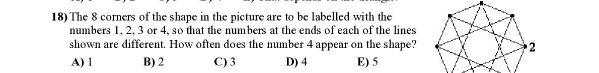 Q18. The 8 corners of the shape in the pi cture are to be labelled with the numbers 1, 2, 3 or 4, so that the numbers at the ends of each of the lines shown are different. How often does the number 4 appear on the shape?