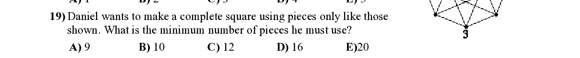 Q19. Daniel wants to make a complete square using pieces only like those shown. What is the minimum number of pieces he must use?