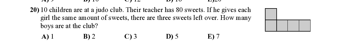 Q20. 10 children are at a judo club. Their t eacher has 80 sweets. If he gives each girl the same amount of sweets, ther e are three sweets left over. How many boys are at the club?