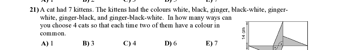 Q21. A cat had 7 kittens. The kittens had the col ours white, black, ginger, black-white, ginger- white, ginger-black, and ginger-black -white. In how many ways can you choose 4 cats so that each time tw o of them have a colour in common.