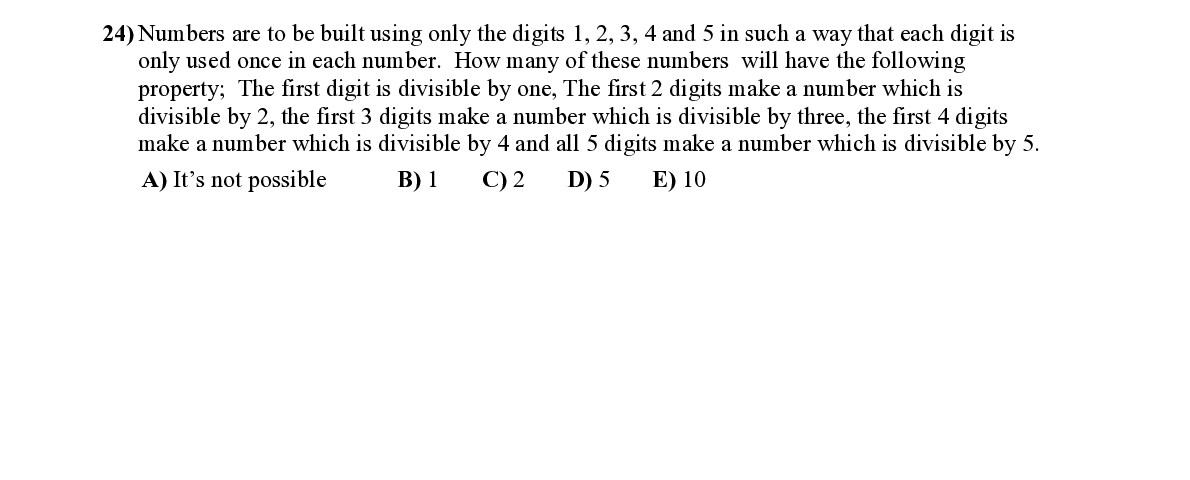 Q24. Numbers are to be built using only the digits 1, 2, 3, 4 and 5 in su ch a way that each digit is only used once in each number. How many of these numbers will have the following property; The first digit is divisible by one, The first 2 dig its make a number which is divisible by 2, the first 3 digits make a number wh ich is divisible by thre e, the first 4 digits make a number which is divisible by 4 and all 5 digits make a number which is divisible by 5.