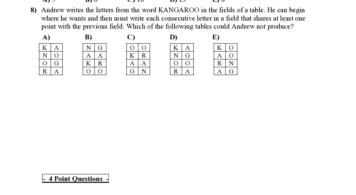 Q8. Andrew writes the letters from the word KANGAR OO in the fields of a table. He can begin where he wants and then must write each consecutiv e letter in a field that shares at least one point with the previous field. Which of th e following tables coul d Andrew not produce?