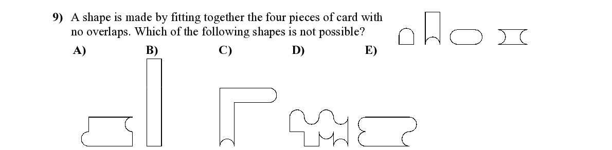Q9. A shape is made by fitting together the four pieces of card with no overlaps. Which of the following shapes is not possible?