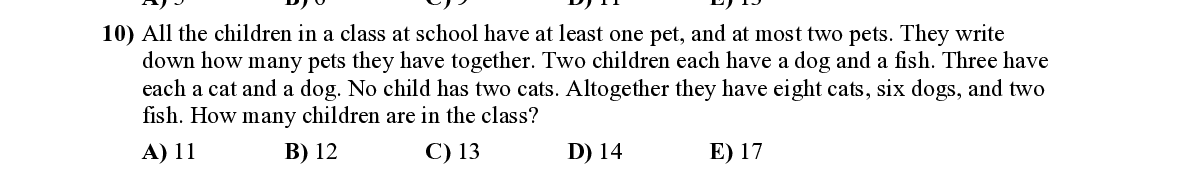 Q10. All the children in a class at school have at l east one pet, and at most two pets. They write down how many pets they have together. Two ch ildren each have a dog and a fish. Three have each a cat and a dog. No child has two cats. Altoge ther they have eight cats, six dogs, and two fish. How many children are in the class?