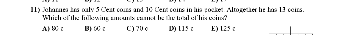 Q11. Johannes has only 5 Cent coins and 10 Cent coins in his pocket. Altogether he has 13 coins. Which of the following amounts cannot be the total of his coins?