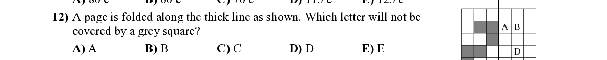 Q12. A page is folded along the thick line as shown. Which letter will not be covered by a grey square?