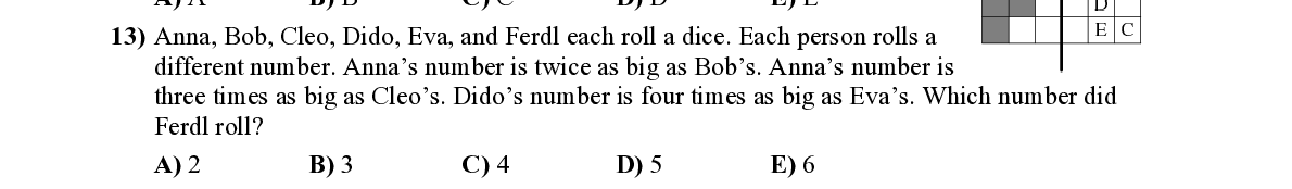Q13. Anna, Bob, Cleo, Dido, Eva, and Ferdl each roll a dice. Each person rolls a different number. Anna’s number is twi ce as big as Bob’s. Anna’s number is three times as big as Cleo’s. Dido’s number is four times as big as Ev a’s. Which number did Ferdl roll?