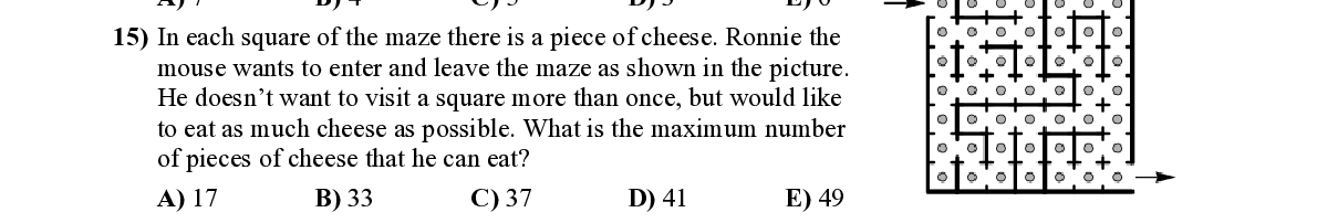 Q15. In each square of the maze there is a piece of cheese. Ronnie the mouse wants to enter and leave th e maze as shown in the picture. He doesn’t want to visit a square more than once, but would like to eat as much cheese as possibl e. What is the maximum number of pieces of cheese that he can eat?