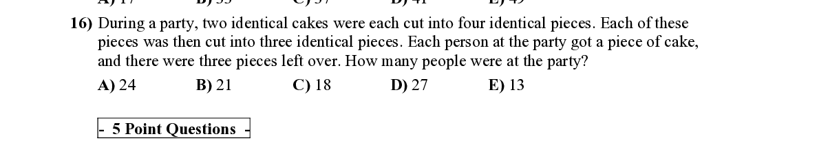 Q16. During a party, two identical cakes were each cu t into four identical pieces. Each of these pieces was then cut into three identical pieces. Each person at the party got a piece of cake, and there were three pieces left over. How many people were at the party?