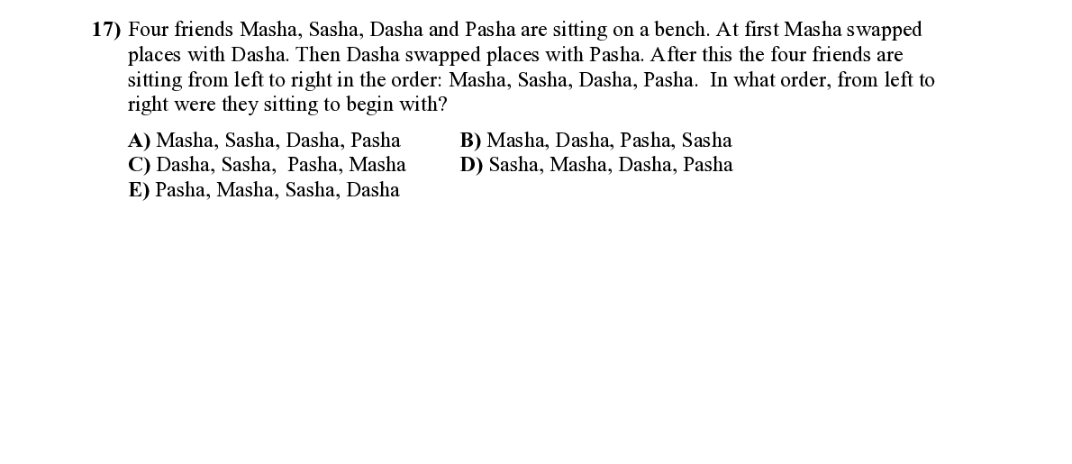Q17. Four friends Masha, Sasha, Dasha and Pasha are sitting on a bench. At first Masha swapped places with Dasha. Then Dasha swapped places w ith Pasha. After this the four friends are sitting from left to right in the order: Masha, Sasha, Dasha, Pasha. In what order, from left to right were they sit ting to begin with?