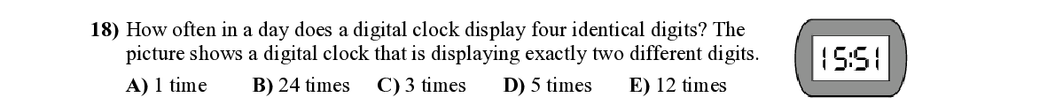 Q18. How often in a day does a digital cloc k display four identical digits? The picture shows a digital cloc k that is displaying exac tly two different digits.