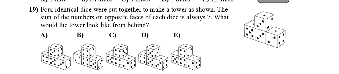 Q19. Four identical dice were put togeth er to make a tower as shown. The sum of the numbers on opposite faces of each dice is always 7. What would the tower look like from behind?