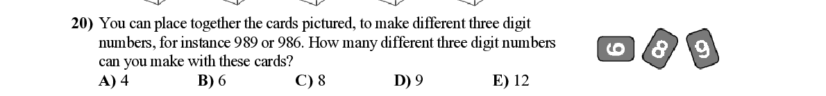 Q20. You can place together the cards pict ured, to make different three digit numbers, for instance 989 or 986. How many differ ent three digit numbers can you make with these cards?
