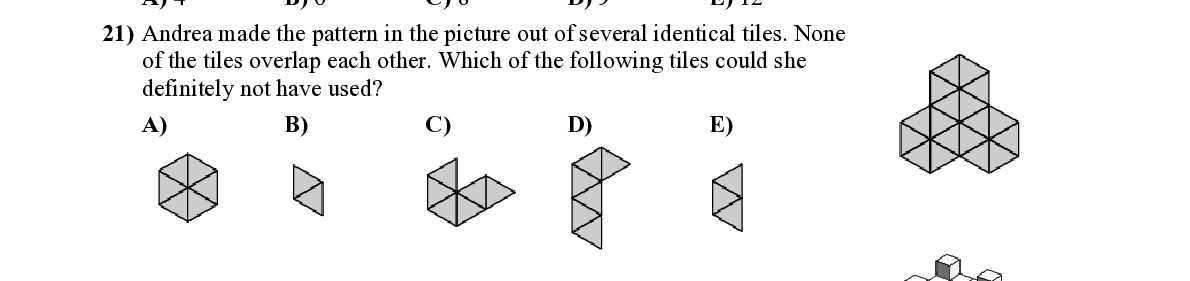 Q21. Andrea made the pattern in the picture out of several iden tical tiles. None of the tiles overlap each other. Wh ich of the following tiles could she definitely not have used?