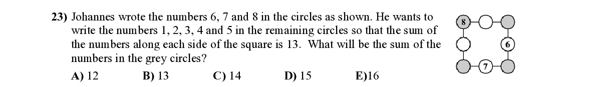 Q23. Johannes wrote the numbers 6, 7 and 8 in the circles as shown. He wants to write the numbers 1, 2, 3, 4 and 5 in the remaining circles so that the sum of the numbers along each side of the square is 13. What will be the sum of the numbers in the grey circles?