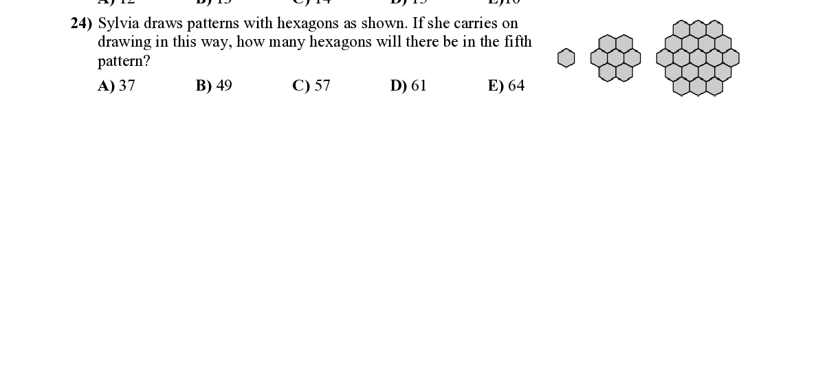 Q24. Sylvia draws patterns with hexa gons as shown. If she carries on drawing in this way, how many hexa gons will there be in the fifth pattern?